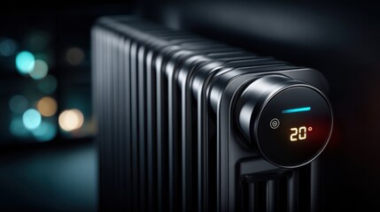 Modern radiator with digital display and thermostat, highlighting brushed metal texture and minimalist design. Ideal for energy efficiency and smart home concepts.