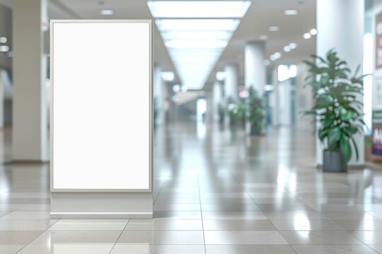 Mock-Up promotion poster displayed on the front of bright blur medical clinic, hospital interior background with defocused effect. Blank A4 white paper on abstract defocused luxury office corridor. Ad