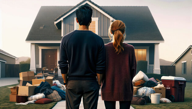 Husband and wife now homeless watching their foreclosed suburban home after eviction for foreclosure in a housing market crash.