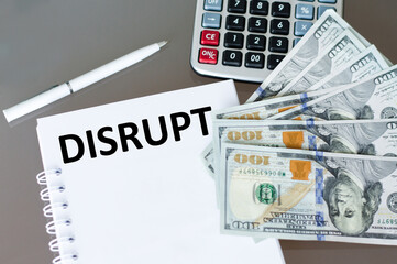 Disrupt text on a notebook on a table next to money, calculator and white pen