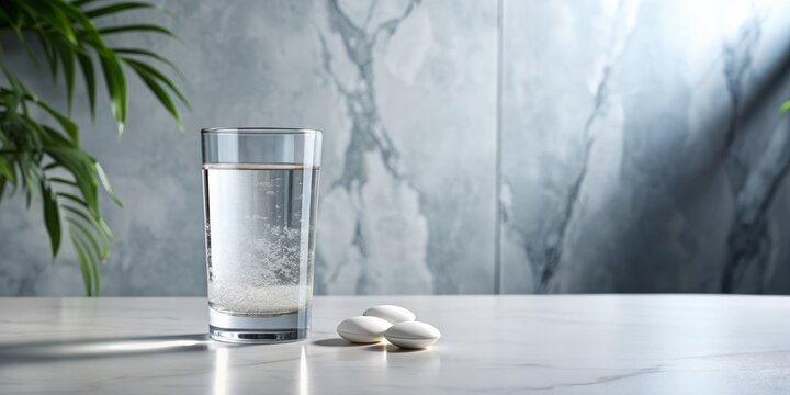 Sparkling glass of water with a dissolving effervescent tablet on a sleek marble table, surrounded by a minimalist interior, with ample copy space.