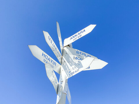Mountainous road with a distance marker to Marrakech under a cloudy sky. Ouarzazate, Morocco