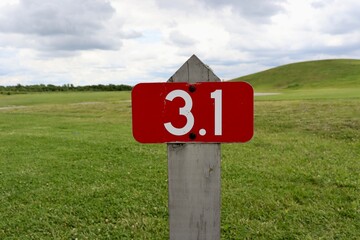 Stone marker in a sunny meadow with wildflowers and trees in the distance