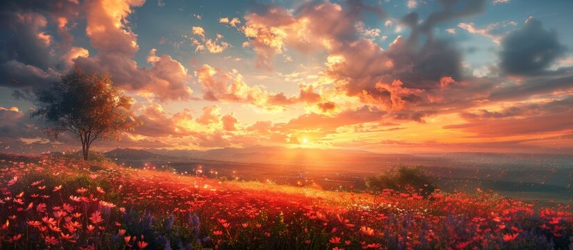 Sunset over a field of wildflowers with a tree and distant mountains.