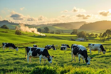 Herd of Holstein Friesian cows grazing in a verdant pasture. Rolling hills and a distant smokestack form the idyllic rural backdrop, bathed in the golden light of sunset.
