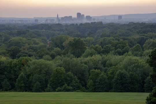 Aerial lush urban park at golden hour showing curving pond, footbridge and distant skyline