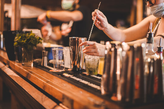 Dettaglio mani di baristi in un momento di preparazione di bevande alcoliche poste sopra di un bancone in legno in un locale estivo notturno
