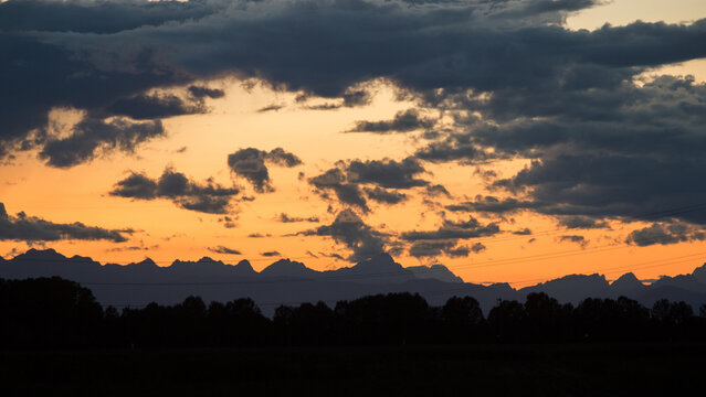 visuale in primo piano di un cielo nuvoloso durante un tramonto color arancione e delle sagome scure delle montagne distanti viste da lontano