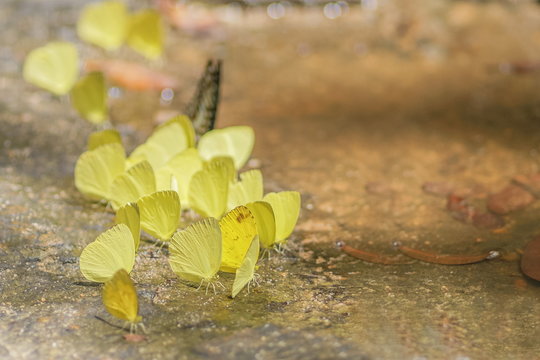 a group of Tree Yellow Butterfly (Gandaca harina distanti) feeding on the ground near by water.