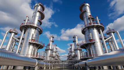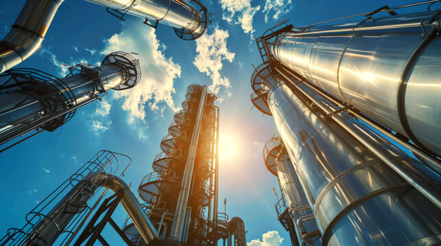 In the heart of the petrochemical industry, silver pipelines and distillation columns stand tall, bathed in the clarity of a blue sky