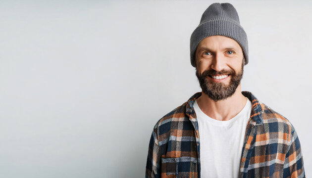A young male hipster with a distinctive beard and beanie, smiling directly at the camera. The clean white background highlights his relaxed style and confident demeanor