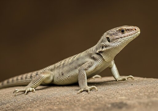 A desert lizard with distinctive striped pattern rests on a rocky surface