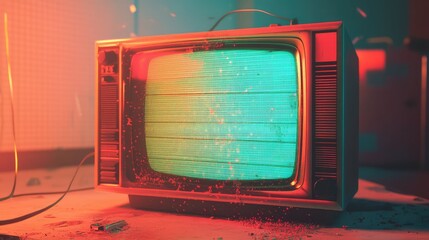 Vintage television with screen glitch in retro interior