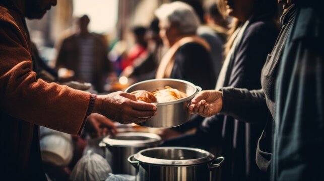 Volunteers prepare and distribute delicious free food to homeless and needy people on the street. Charity, Donation, Assistance concepts.