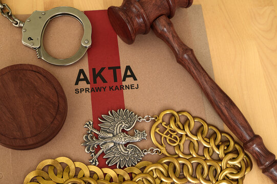 Attributes of the justice system, handcuffs, files, documents, a judge's gavel and chain lying on a desk