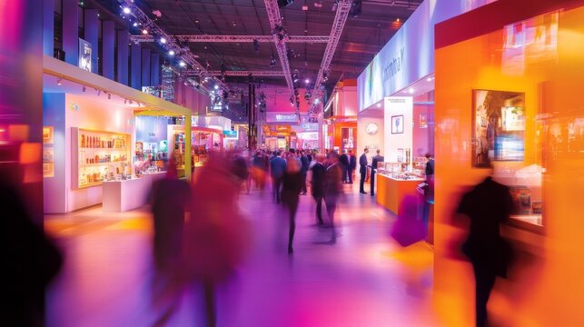 Attendees move energetically through a lively exhibition hall filled with colorful booths and displays, engaging in conversations and exploring various offerings