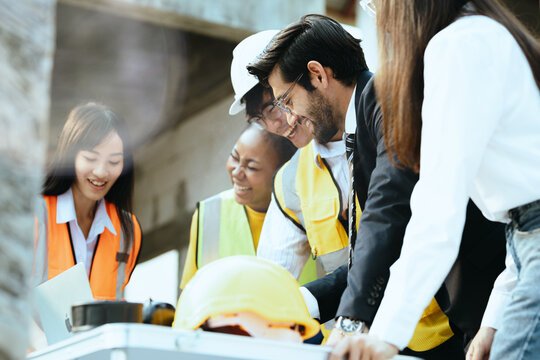Diverse Business Colleagues Analyzing Technical Drawing In Office Images