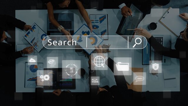A diverse business team collaborates over data analysis documents, utilizing laptops and a digital search interface, showcasing teamwork and innovation in a modern workspace. Raster