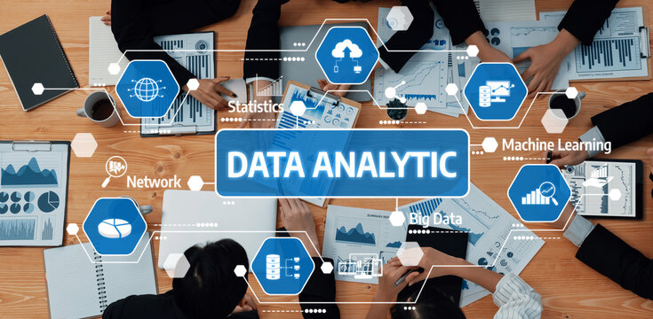 A diverse team collaborates on data analytics, analyzing statistics and strategies with charts and technology tools, enhancing business decisions and performance insights. Amity