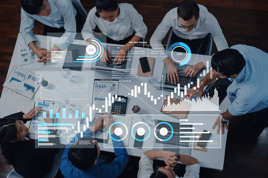 Top down aerial of collaborate professional diverse business people discuss marketing strategy with hologram of marketing data analysis graph, diagram or financial profit investment plan. Directorate.