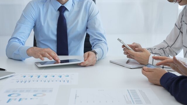 Business team working together, analyzing financial charts and data on digital tablet and smartphones, during a productive meeting in a modern office
