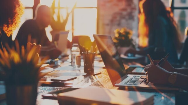 Diverse business team in blurred meeting room brainstorming collaboration strategy