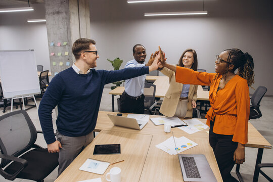 Diverse businesspeople high fiving, celebrating collaborative achievement with enthusiasm in contemporary workplace setting