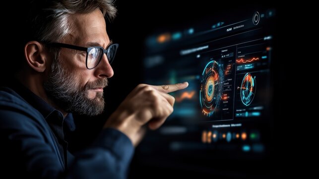 Man analyzing digital data interface with futuristic graphics