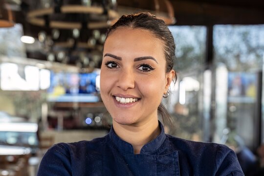 Young north african chef woman smiling on camera at the restaurant - Focus on face