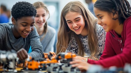 Diverse group of students collaborating on a robotics project, excited and engaged, hands-on STEM learning.