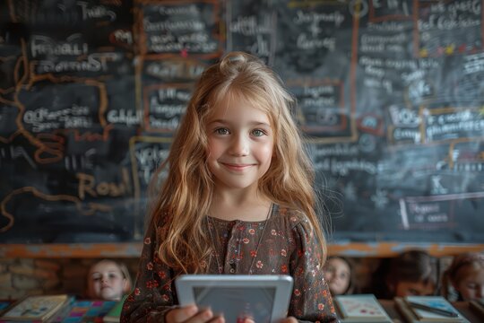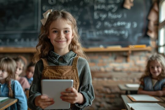 Happy smiling school girl 7-8 years old Standing in front of the classroom reading her research on a tablet