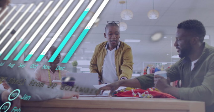 Diverse colleagues analyzing data in modern office with digital charts overlay