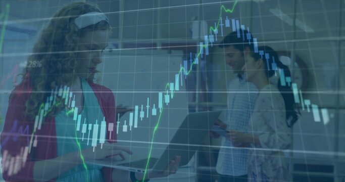 Typing adult woman with turquoise top using laptop in office with stock chart overlaid, copy space