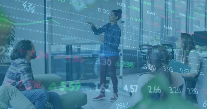Image of financial data processing over diverse colleagues having meeting in office