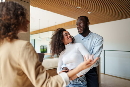 Young diverse couple celebrates property purchase in contemporary home interior while professional realtor observes their milestone achievement in casual business attire.