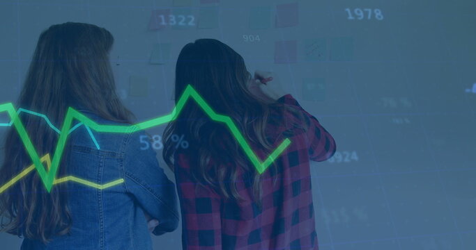 Coworkers analyzing digital data with overlayed graphs in modern office