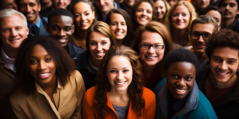 Diverse crowd smiling faces happy multiethnic group young people friends community together unity portrait positive friendly teamwork looking camera overhead view