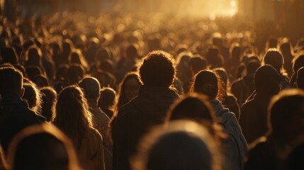 Illuminated Crowd: A large crowd of people silhouetted against a bright, golden light, creating a scene of anonymity and collective movement, with a mysterious and evocative atmosphere.
