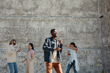 Wide angle view at diverse group of young people dancing outdoors in urban setting against grey concrete wall, copy space