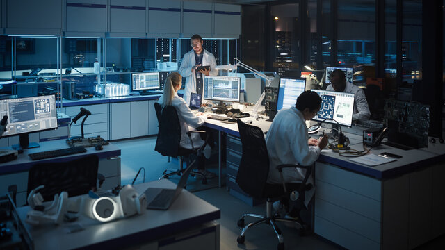 Modern Electronics Development Facility: Diverse Team of Multi-Ethnic Engineers, Scientists Work on Computers, Design Robotics PCB, New Generation Silicon Microchips, Manufacturing Semiconductors