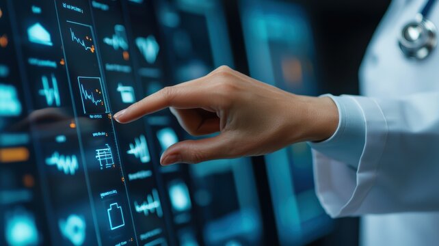 A hand of a medical professional interacts with a digital interface displaying various health data and graphs.