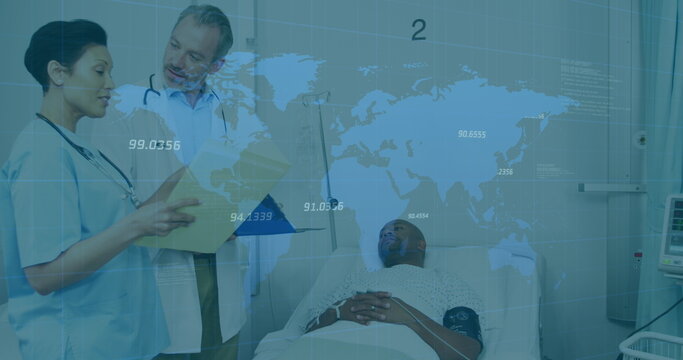 Diverse doctors analyzing global medical financial data