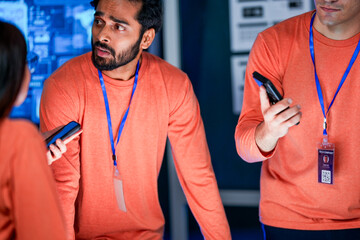 A data analytics team in a command center reviews a live security feed on a mobile device. They are collaborating on a strategy to respond to a new threat on the network.
