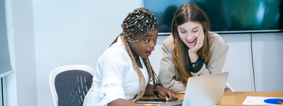 Diverse female coworkers collaborating at laptop in modern open-plan office, teamwork