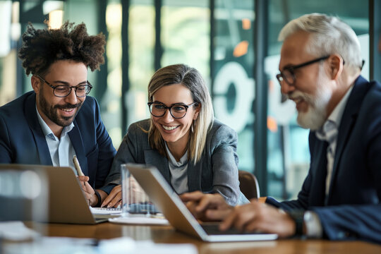Diverse team of young professionals collaborate on project using laptops. People work together in modern office space, sharing ideas and smiling during meeting. Group engaged in tech discussion.