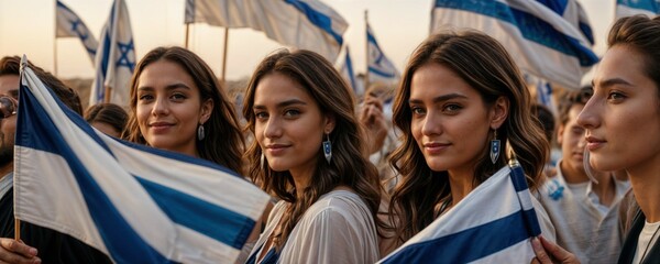 A diverse group proudly holds Israeli flags high in a crowd