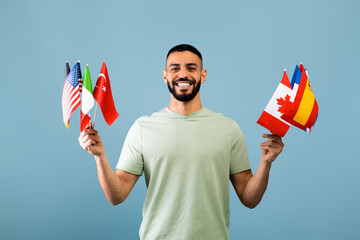 Happy arab guy showing bunch of diverse flags cheerfully smiling to camera over blue studio background