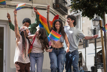 Man holding rainbow flags on a city street, showcasing lgbtq pride with vibrant colors and diverse unity outdoors.