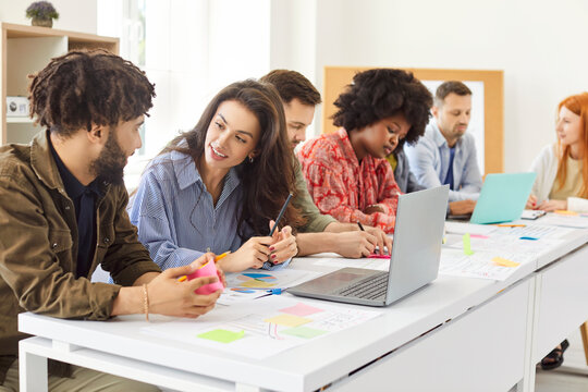 Team of young diverse multiracial people sitting at office table, working on their business projects, discussing ideas, developing marketing plans, and using laptops