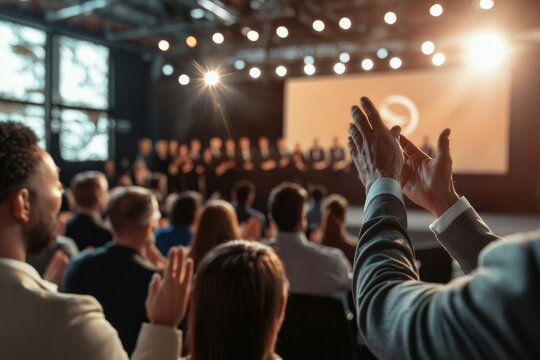 Diverse Business People Applauding Conference Meeting Attendees Successful Presentation Corporate Event Team Collaboration Professional Audience Happy Smiling Faces Motivational Speaker group sales